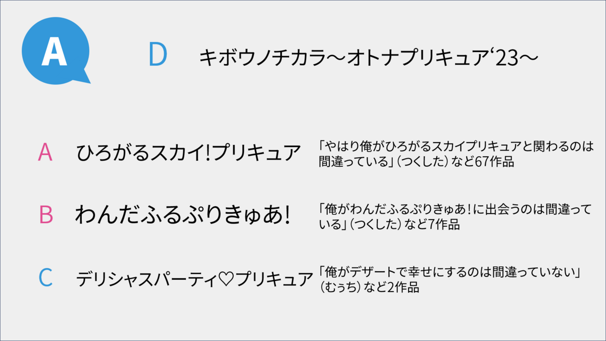 でも、もう覚悟を決めてDにいく。『無職転生』『ユーフォ』は作品の時期的にも人気的にも間違いなくあるし、『ダンジョン飯』はかなり微妙なラインだけど、『第七王子』よりは……ある気がする!!