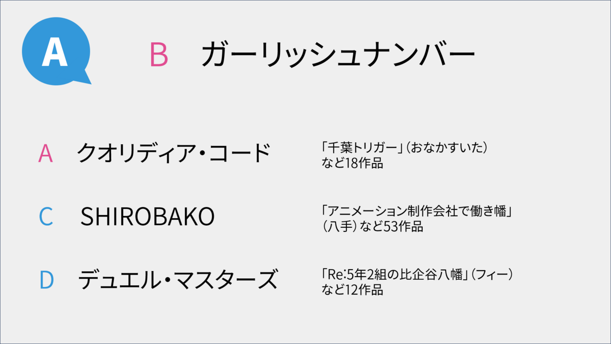 まず『SHIROBAKO』と『ガーリッシュナンバー』は外していいと思う。どっちも中高のオタクが憧れる要素だし、俺も憧れてる。『クオリディア・コード』はなんとも言えないけど、『デュエマ』の層とは被ってるようには思えないからDかも